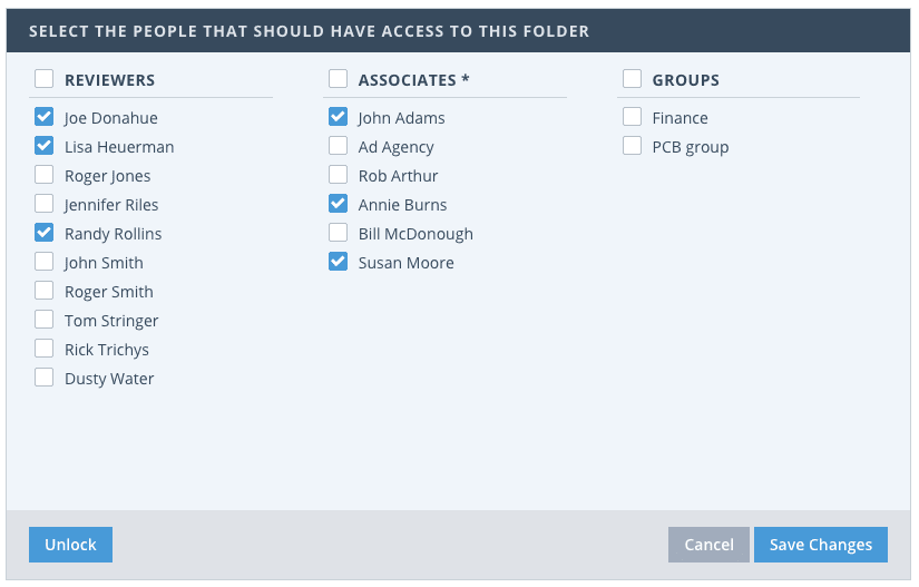 Create distinct, secure workspaces for each of your clients or projects. You determine which workspaces each person can access. Restrict access further by project, folder or document, so that each person only sees information appropriate to his/her role.